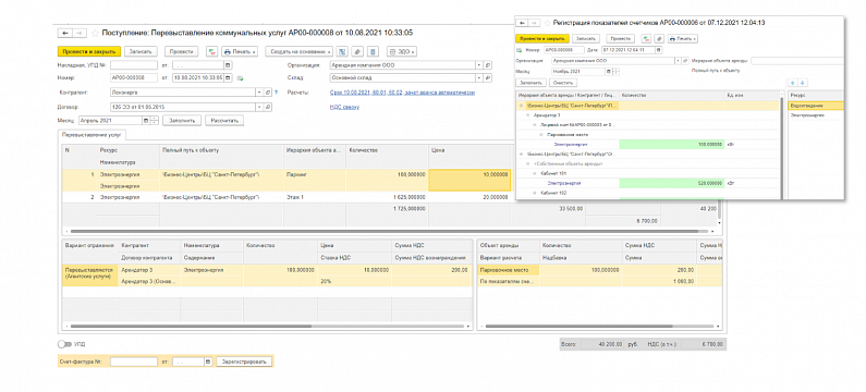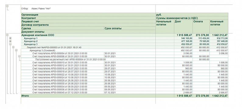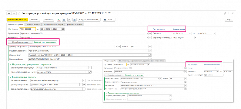 - ведение учета дополнительных соглашений, изменений арендных условий в рамках одного договора;