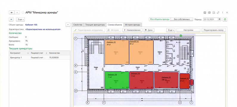 - Оперативное и наглядное получение информации о свободных и занятых объектах и текущих арендаторах.