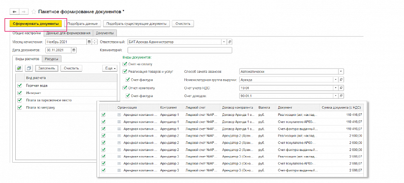- автоматическое формирование пакета сопроводительных документов (счета, акты, счет-фактуры).