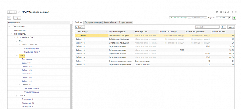 Решение предназначено для автоматизации учета любых объектов аренды (помещений, оборудования, спецтехники, парковочных мест и т.д.)