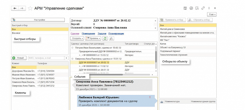 • Управление клиентской базой: создание и ведение событий по клиентам; выполнение задач по сделкам; оповещение менеджера по датам звонка; прикрепление договора на предоплату, бронирование, продажу и т.д.
