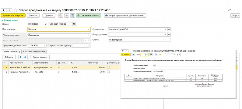 - Формирование запросов предложений от поставщиков на основании заявок на МПЗ.