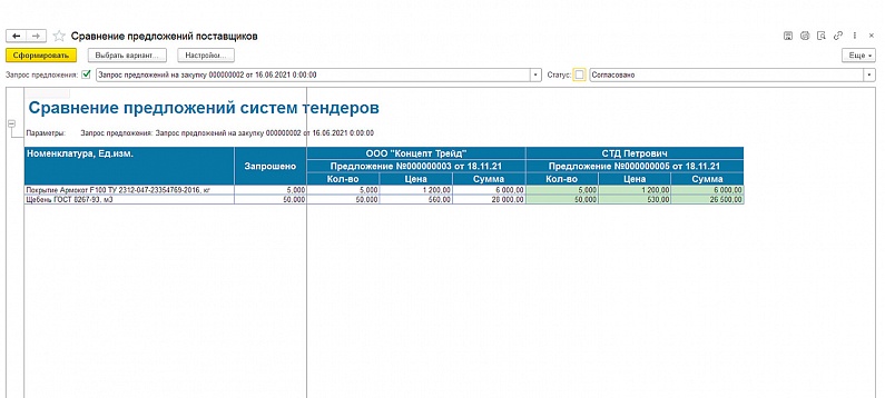 - Сравнение полученных предложений от поставщиков, выбор оптимальных закупочных цен.
